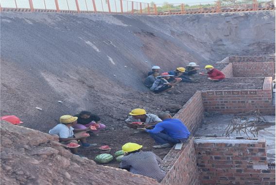 (一線工人食用西瓜解暑)