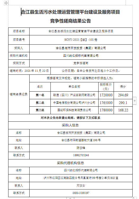 合江縣生活污水處理運(yùn)營管理平臺(tái)建設(shè)及服務(wù)項(xiàng)目競(jìng)爭(zhēng)性磋商結(jié)果公告