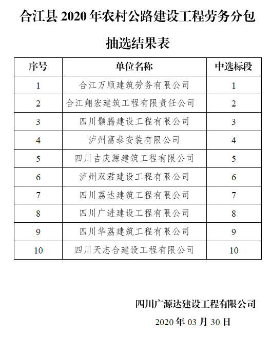 合江縣2020年農(nóng)村公路建設(shè)工程勞務(wù)分包抽選結(jié)果表