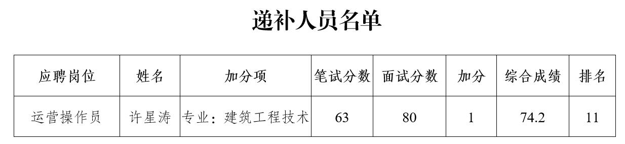 根據(jù)《瀘州阜陽投資集團(tuán)有限公司關(guān)于合江縣城市開發(fā)投資(集團(tuán))有限公司下屬子公司合江縣華陽水業(yè)有限公司2020年公開招聘工作人員的公告》的規(guī)定,按綜合成績排名,因1名擬聘用人員自動放棄,現(xiàn)將擬聘用人員的遞補人員名單面向社會公示7個工作日,公示時間2020年7月8日至2020年7月16日。公示期間,如有問題,請及時向瀘州阜陽投資集團(tuán)有限公司組織與人力資源管理部反映。要求舉報者署實名,實事求是地反映問題,并提供必要的調(diào)查線索。