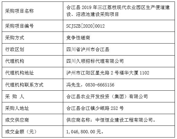 合江縣2019年三江荔枝現(xiàn)代農(nóng)業(yè)園區(qū)生產(chǎn)便道、沼液池建設(shè)采購項目競爭性磋商成交公告