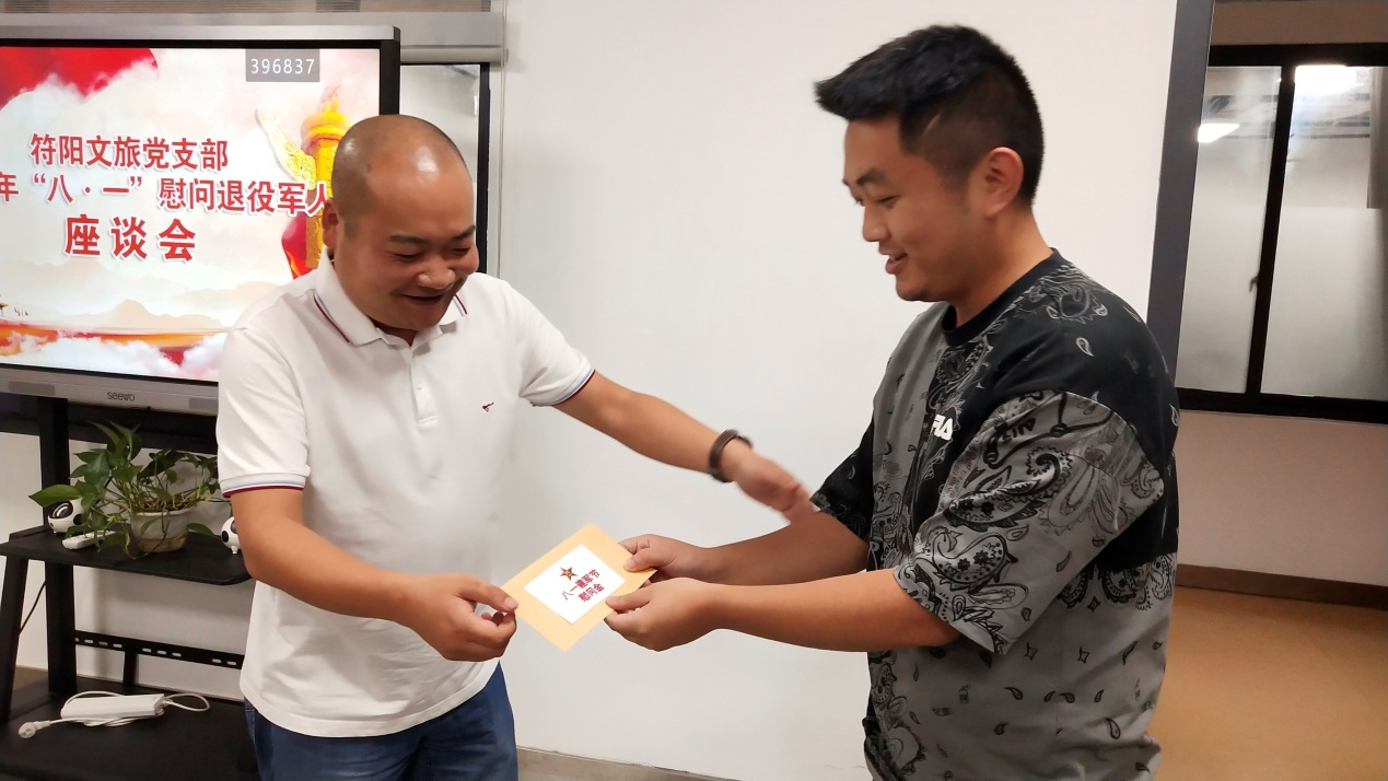 為扎實做好擁軍優(yōu)屬 、 擁政愛民工作 , 在 “ 八 一 ” 建軍節(jié)來臨之際, 符陽文旅黨支部開展 “ 八一 ” 慰問活動, 組織文旅 公司工作的退役軍人召開座談會, 了解他們的工作和生活情 況, 為他們送上慰問金, 并致以節(jié)日的祝福。 退役軍人表示 感受到公司的關(guān)懷和愛心,在今后的工作中發(fā)揮軍人本色, 為公司發(fā)展貢獻力量。