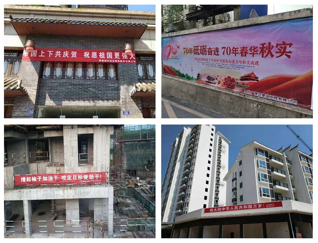 為慶祝新中國成立70周年,城投公司、廣源達(dá)公司、鑫晟公司于近日在公司項(xiàng)目部、售樓部等地懸掛慶祝標(biāo)語,激發(fā)群眾愛國熱情,營造良好國慶氛圍!